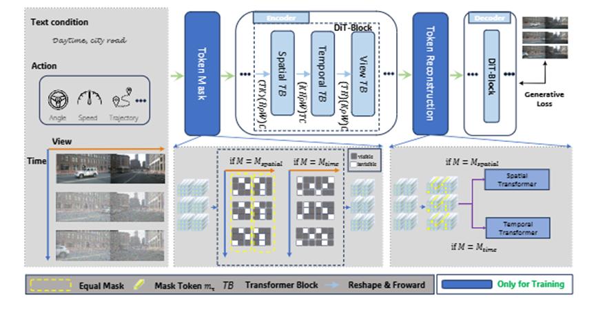 得益于基于扩散的图像生成系统的快速发展,最近一系列方法基于扩散模型构建世界模型。尽管能够生成高保真结果,这些方法仍面临长时预测和泛化能力的挑战。在这篇文章中,我们认为在构建自动驾驶通用世界模型方面仍存在两个问题。首先,大规模训练数据集与更具扩展性的变压器架构的结合仍在探索中。其次,一个基本问题仍未得到解答:基于扩散的生成损失是否足以构建一个通用的世界模型?由于扩散损失在像素级别操作,视觉语义的学习可能并不直接。另外,一些工作已表明扩散模型与自监督方法是互补的,有利于提高收敛速度和生成质量。基于上述分析,我们设计了MaskGWM,旨在提高现有方法的保真度、泛化能力和长时间序列预测能力。此外,通过集成多视图模块,我们的模型还能生成多视图案例。我们采用DiT作为主干网络,它更具扩展性,能够利用多种数据集的信息。此外,我们将掩码重建作为生成的补充任务。此外,通过自监督学习获得的特征在语义上更具意义,可以作为辅助监督进一步改善生成质量。然而,将现有的图像生成掩码重建集成到驾驶世界模型中并非直接可行,仍有两个问题需要解决:(1)如何增强扩散模型与掩码重建之间的协同作用。(2)我们应该使用哪种掩码策略来处理视频数据。