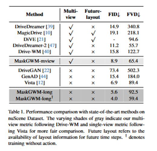 我们展示了一系列广泛的实验来评估模型的性能,我们使用SD3作为基础模型,使用FID和FVD作为评测指标,在Nuscenes,OpenDV和Waymo数据集上评估了模型的性能: