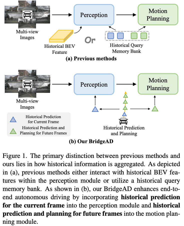 端到端自动驾驶通过可微框架统一多任务,支持以规划为导向的优化,近年来受到广泛关注。现有方法主要通过密集的历史鸟瞰图(BEV)特征或稀疏的记忆库查询来聚合历史信息,沿用了检测任务的传统范式。然而,我们认为这些范式要么忽略了运动规划中的历史信息,要么未能与其多步骤特性(需预测或规划多个未来时间步)有效对齐。基于“未来是过去的延续”这一理念,我们提出BridgeAD方法,将运动与规划查询重构为多步骤查询,以区分每个未来时间步的查询目标。这一设计使得历史预测与规划信息能够根据时间步针对性地应用于端到端系统的不同模块,从而提升感知与运动规划的协同性。