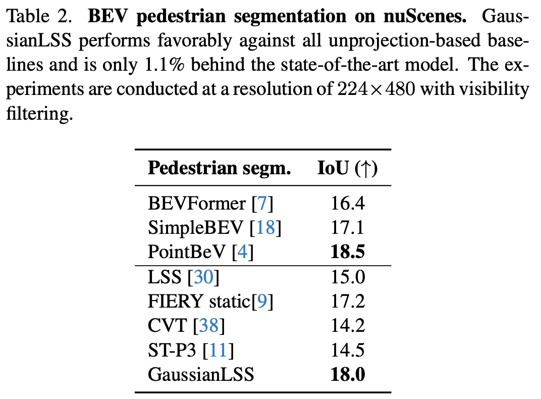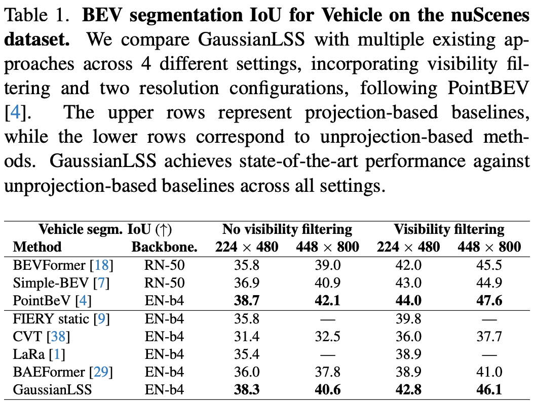 作者将 GaussianLSS 与基于反投影和投影的方法进行了比较。如表 1 所示,GaussianLSS 在所有基于反投影的方法中表现最佳,并且与基于投影的方法相比具有相当的性能。作者观察到,即使使用多尺度渲染,GaussianLSS 在预测对象形状方面仍然比基于投影的方法差,但能够捕捉到更远距离的对象。