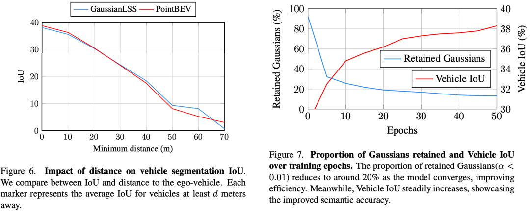 作者评估了 GaussianLSS 在不同距离上从自车的性能,重点关注其准确表示远距离物体的能力。为此,作者通过排除距离自车一定近邻阈值内的预测来计算 IoU。图 6 比较了 GaussianLSS 与基于投影的最先进方法 PointBEV。两种模型都表现出随着距离增加而准确度下降的相似趋势,这是由于深度模糊性增加所致。