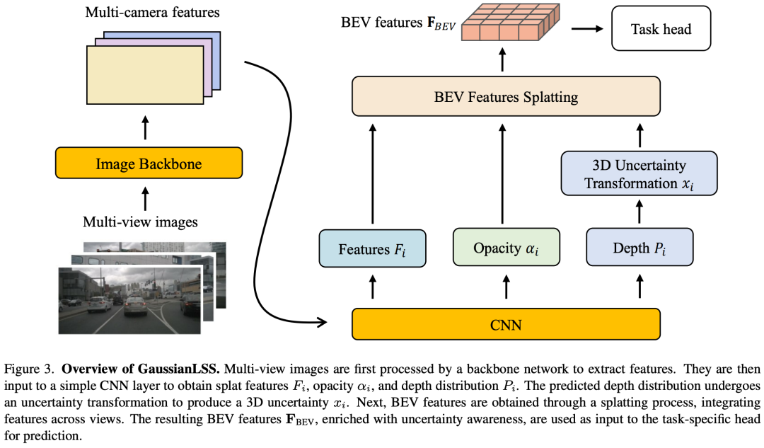作者的目标是将深度不确定性建模整合到 BEV 表示流程中,以应对现实场景中的深度模糊性挑战。GaussianLSS 的概述如图 3 所示。
