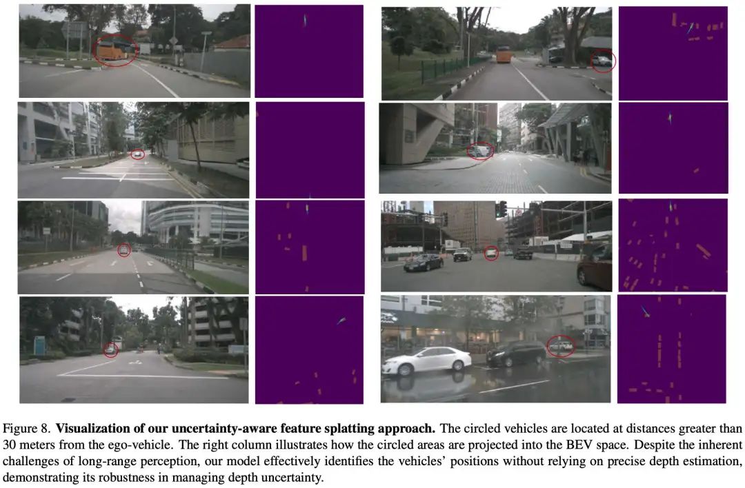 图 8 展示了模型在长距离感知方面的鲁棒性,涵盖了 8 种不同场景。作者可视化了在 BEV 平面上绘制后的不确定性感知特征。尽管长距离感知存在固有挑战,包括深度模糊性增加,GaussianLSS 利用不确定性感知特征专注于感兴趣区域,同时保持 BEV 投影的准确性。