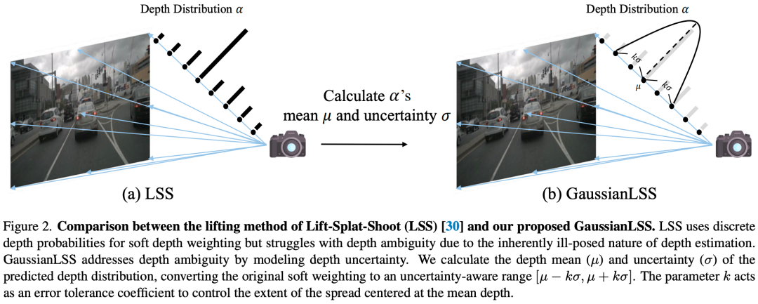 Lift-Splat-Shoot (LSS) 引入了一个高效的流程,将 2D 特征提升到 3D,这一设计已成为 3D 感知任务的基础。这种方法严重依赖于准确的深度估计,这使得它对深度预测误差敏感,这些误差可能会传播到 BEV 表示中。为了缓解这一问题,后续工作增加了深度监督作为辅助损失,以提高深度准确性。尽管这些方法使用概率深度分布来软性提升特征,但它们通常缺乏对深度不确定性的显式表示。这一限制阻碍了它们在复杂场景中有效处理深度模糊性的能力。GaussianLSS 通过将深度不确定性显式建模为概率分布的方差来解决这一问题。这种不确定性感知的深度表示减少了对精确深度估计的依赖,允许模型捕捉围绕深度均值的可变空间范围,见图2。