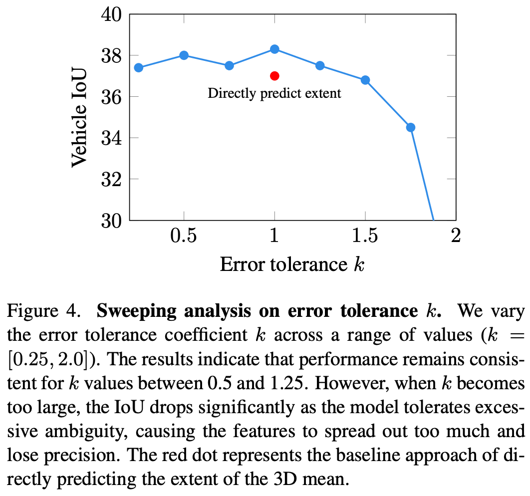 分析结果如图 4 所示。另一方面,作者也尝试直接预测一个固定的范围,而不是建模不确定性。通过比较这两种方法,作者旨在突出将不确定性纳入 BEV 特征提取过程的优势,因为直接预测范围会导致性能降低 1.3%。
