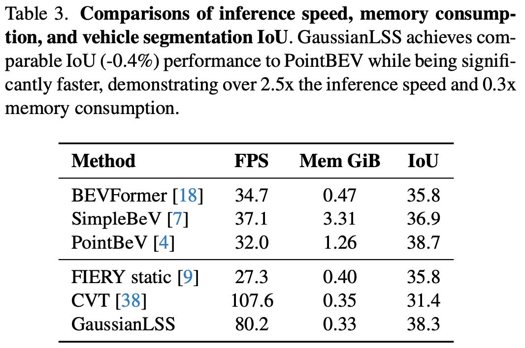 此外,表 2 比较了行人类别分割,而表 3 显示了推理速度和内存消耗。GaussianLSS 实现了 80.2 FPS,比 PointBEV 快 2.5 倍,展示了其效率。除了列出的任务外,作者还在其他应用中评估了 GaussianLSS,包括地图分割和 3D 目标检测。这些结果进一步验证了 GaussianLSS 在不同任务中的多功能性,显示了不确定性表示的有效性。