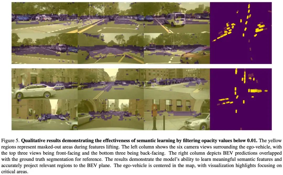 作者在图 5 中展示了定性结果。黄色区域表示在特征提升过程中由于低不透明度值而被屏蔽的区域,确保模型专注于语义重要的特征。GaussianLSS 即使在存在遮挡和杂乱的复杂城市场景中,也能捕捉到关键区域,如车辆。这突出了 GaussianLSS 在学习有意义的特征的同时过滤不相关区域的有效性,从而实现准确且高效的 BEV 表示。