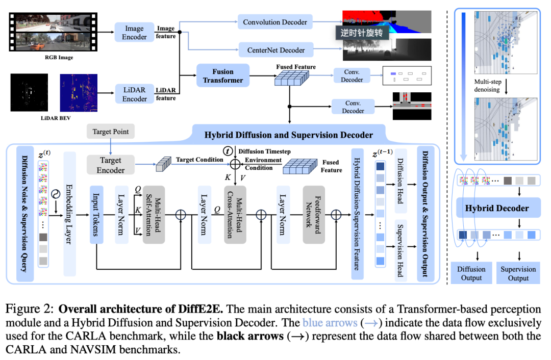 基于这样的背景之下,作者提出了一个新的方案—— DiffE2E 框架(如图2所示)。首先用双向跨注意力让激光雷达和摄像头的数据对齐,把不同传感器的信息融合到一起。然后送进Transformer架构的混合解码器,让扩散模型和传统监督学习组队打配合:扩散模型负责天马行空地想象各种可能轨迹,监督学习则盯紧车速、周围车辆动态这些硬指标。这俩通过跨注意力机制实时交换信息,最后生成既灵活又靠谱的驾驶方案。