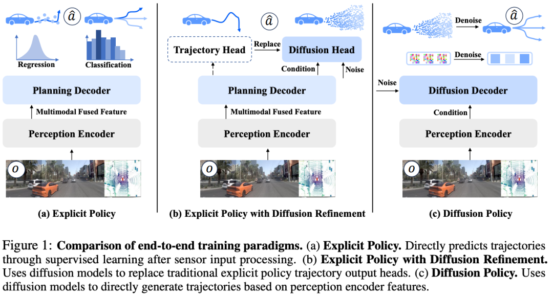 所以,最近有些团队试水用扩散模型做路径规划和端到端控制,用了DDIM、DPM-Solver这些加速技术,效果确实惊艳。不过现在多数方法只是把扩散模型当"后处理插件"(如图1(b)),在传统规划模块后面加个扩散优化。这相当于戴着镣铐跳舞——既丢了原始感知数据的细节,又被前面的模块限制发挥。