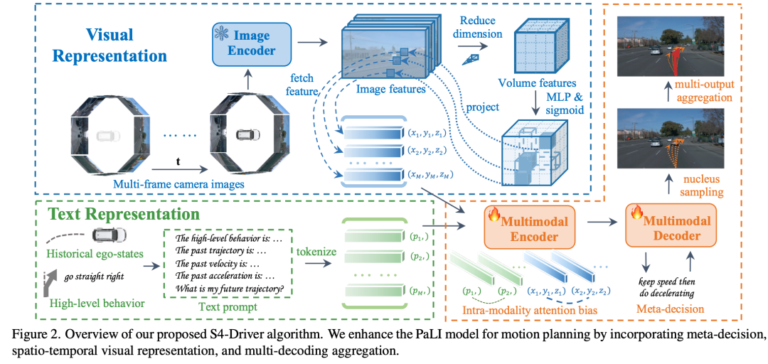 在本文中,作者提出了S4-Driver,这是一个简单而有效的可扩展自监督运动规划方法,具有时空视觉表示。基于通用多模态大语言模型,作者直接从相机图像预测自身车辆的航点,消除了对中间感知和预测任务的需求,从而促进了利用大量未标注驾驶数据进行模型预训练的规模化(图1a)。为了解决非最优的表达形式的障碍,作者提出了一种新颖的稀疏体积表示,能够聚合来自多视图和多帧图像的视觉信息,提升了模型在运动规划上的3D时空推理能力,并无损的保留了MLLMs预训练视觉嵌入中的世界知识。