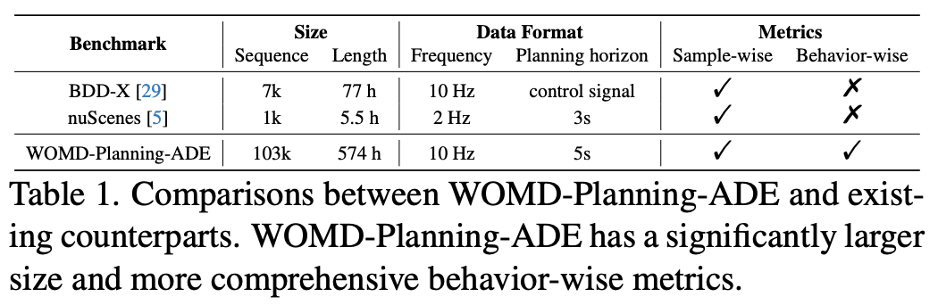 其次,为了严格评估法并提供足够的训练数据,作者还利用了大规模的WOMD-Planning-ADE benchmark,并结合了内部相机传感器数据。该 benchmark 大约比nuScenes大100倍,因此它可以作为一个更全面的基准。