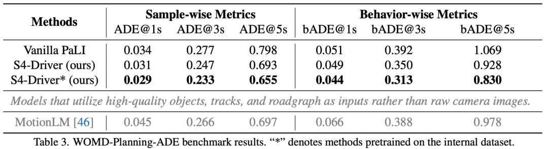 WOMD-Planning-ADE 基准测试:在表 3 中,作者主要将 S4-Driver 与原始 PaLI3-5B 基线和模块化算法 MotionLM 进行了比较。与原始 PaLI3-5B 相比,样本指标和行为指标之间存在显著差距。为了对比,作者还将最新运动预测算法 MotionLM(内部增强的复现版本)适应于规划任务,仅预测自身车辆的未来轨迹,并将高级指令注入模型中。因为它使用了高质量的对象、轨迹和道路图信号作为模型输入,所以直接与作者的端到端方法进行比较并不公平。然而,如表 3 所示,即使 S4-Driver 仅使用原始相机图像作为输入,与 MotionLM 相比,S4-Driver 仍然取得了有利的性能,尤其是在行为指标方面。