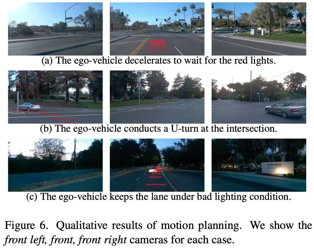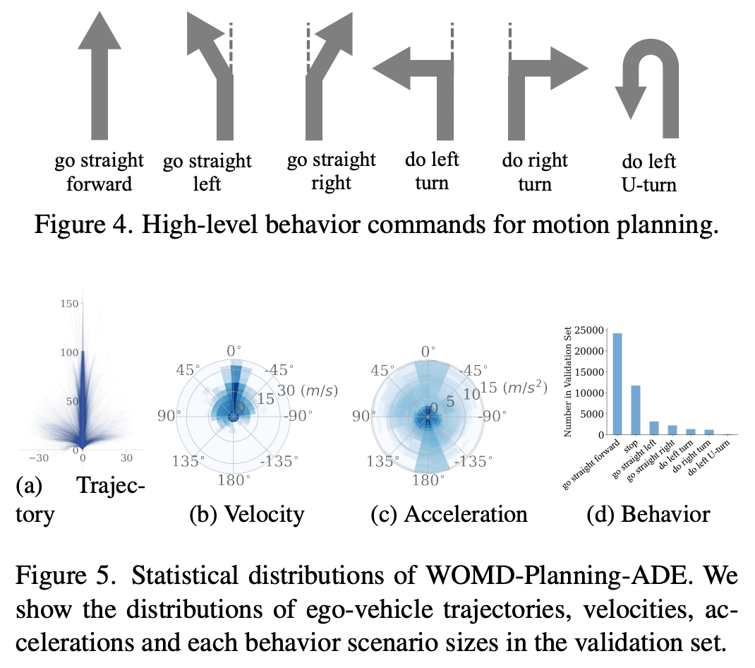 高级行为指令:像导航系统一样,端到端规划系统也需要导航信号来指示行驶方向。作者考虑了六个高级行为指令(见图4),即直行、左转、右转、左转调头等。这些指令可以覆盖现实世界中的多样化驾驶情况,例如“直行右转”描述了驶离高速公路的情况。作者根据长期未来轨迹来决定行为指令,而不是仅仅考虑最后一步的位置,这样可以处理低速或停车的情况。