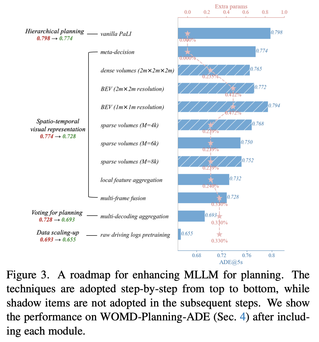 作者定义 包括四个元决策:保持静止、保持速度、加速和减速。与以往在基于 VLM 的规划中需要人类标注进行训练的 CoT 应用不同(例如 DriveVLM 中的场景分析),作者将这些元决策作为“free lunch”引入其中,以简化运动规划过程,而无需任何额外的标注。基于未来自身车辆速度和加速度的启发式规则生成真实决策。图 3 展示了这种简单的设计在规划性能上带来了的较大改进。