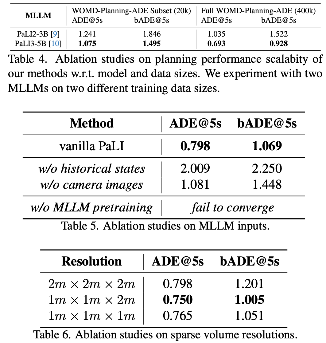 MLLM 能力:除了在其他部分中使用的 PaLI3-5B 外,作者还针对运动规划使用了 PaLI2-3B。如表 4 所示,基于 PaLI2-3B 的 S4Driver 表现明显不如基于 PaLI3-5B 的 S4Driver。作者在 WOMD-Planning-ADE 上进行了两个不同规模的训练数据实验,即 20k(nuScenes 规模)对比 400k(完整 WOMD-Planning-ADE)。在有足够的训练数据时,差距尤为明显。这也证明了在大规模数据集上进行实验的必要性,这可以充分发挥强大 MLLMs 的潜力。