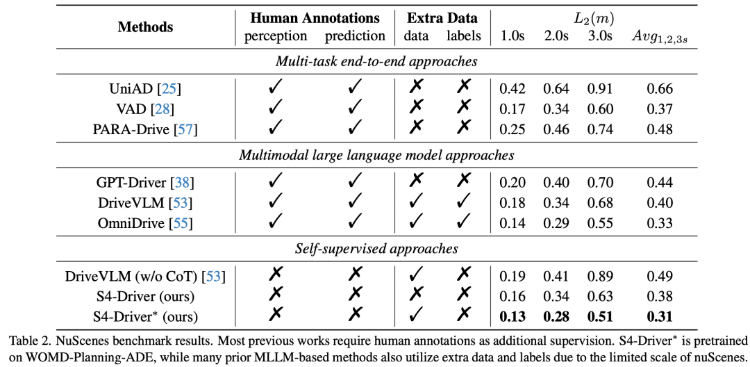 nuScenes 数据集:表 2 显示,S4-Driver 显著优于所有先前的算法。与现有方法不同,S4-Driver 不需要任何感知预训练或人类标注。这种自监督特性使得 S4-Driver 能够利用所有可获取的原始轨迹数据。