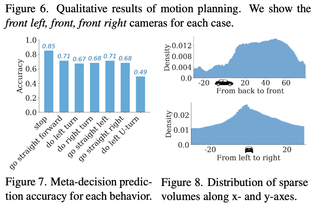 稀疏体积分布:作者在图 8 中可视化了沿 x 轴和 y 轴的自监督学习稀疏体积的分布。从后到前,稀疏体积集中在前面区域。从左到右,稀疏体积覆盖了所有区域,因为存在转弯场景,但大多数体积集中在中间区域。这些分布与人类驾驶经验一致。