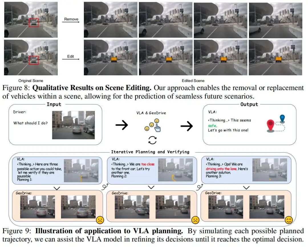 2️⃣ 动态编辑模块:突破静态渲染局限 通过融合 2D 边界框注释,GeoDrive 支持对可移动物体的灵活位置调整,解决传统渲染中“场景冻结”的假设; 在训练阶段显著提升多车交互场景的动态合理性和模拟真实度。