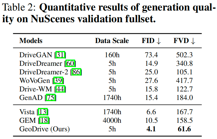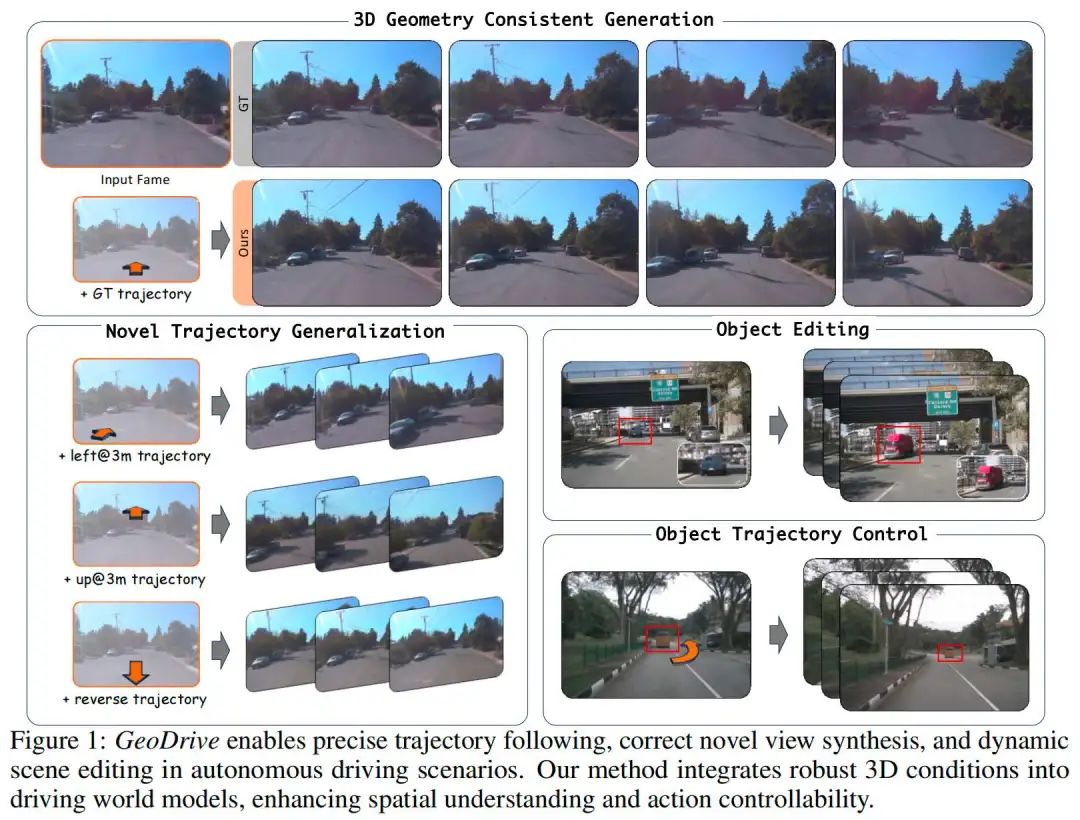 世界模型的最新进展彻底改变了动态环境的仿真,使系统能够预见未来状态并评估潜在动作。在自动驾驶中,这些能力有助于车辆预测其他道路使用者的行为、进行风险感知规划、加速仿真中的训练,并适应新场景,从而提高安全性与可靠性。当前的方法在保持 鲁棒的 3D 几何一致性或处理遮挡时存在缺陷,这在自动驾驶任务的安全评估中至关重要。为了解决这些问题,本文提出了 GeoDrive,该方法将 鲁棒的 3D 几何条件显式地整合到驾驶世界模型中,以增强空间理解能力和动作可控性。具体来说,我们首先从输入帧中提取 3D 表示,然后基于用户指定的自车轨迹获得其 2D 渲染结果。为了实现动态建模,我们在训练过程中提出了一种动态编辑模块,通过编辑车辆的位置来增强渲染效果。大量实验表明,我们的方法在动作准确性和 3D 空间感知方面显著优于现有模型,实现了更加真实、可适应和可靠的场景建模,从而提高了自动驾驶的安全性。此外,我们的模型能够泛化到新的轨迹,并提供交互式的场景编辑功能,例如目标编辑和目标轨迹控制。