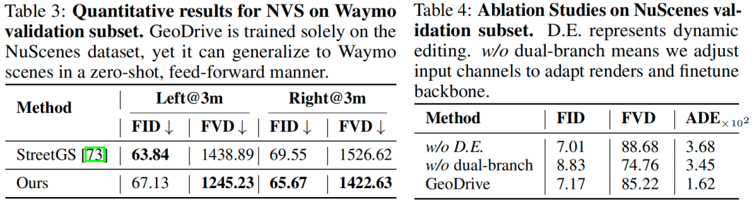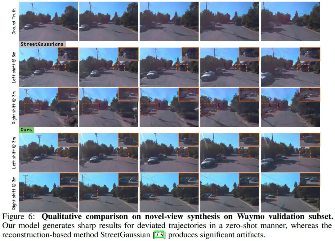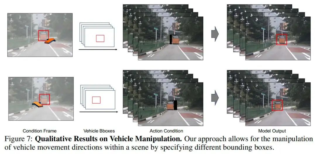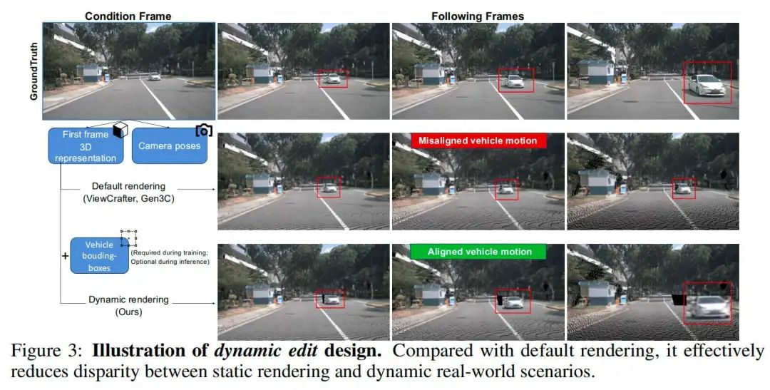 动态编辑:为了解决这一限制,我们提出动态编辑,以生成具有静态背景和移动车辆的渲染结果 。具体来说,当用户提供场景中移动车辆的一系列 2D 边界框信息时,我们动态调整它们的位置,以在渲染中创建运动的错觉。这种方法不仅在生成过程中引导自车轨迹,还控制场景中其他车辆的运动。图 3 展示了这一过程。这种设计显著减少了静态渲染与真实动态场景之间的差异,同时实现了对其他车辆的灵活控制——这是现有方法如 Vista和 GAIA所不具备的能力。