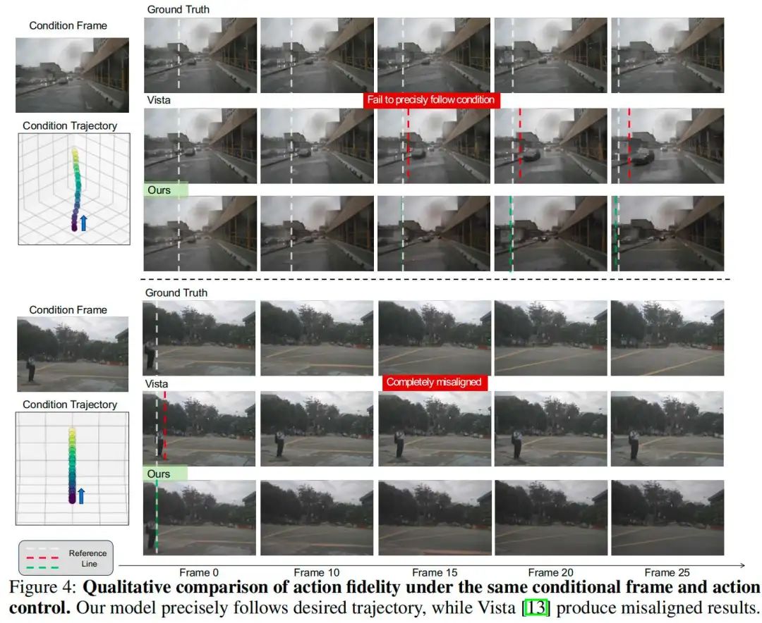 尽管现有的生成模型(如 DriveDreamer和 DrivingDiffusion)通过依赖密集标注(例如高精地图序列和长期的 3D 边界框轨迹)实现了准确的场景控制,但它们只能重复预设动作,而无法真正理解车辆动力学。一种更灵活的方法是直接从单张(或少量)图像中推断动态先验信息,同时结合所需的自车轨迹进行条件设定。最近的系统如 Vista、Terra和 GAIA 1&2通过将原始数值控制向量直接注入生成主干网络,实现了基于动作的生成。然而,由于控制向量并未显式地与视觉潜在空间对齐,导致生成的动作信号较弱,常常导致控制不稳定,需要更大的训练数据集才能收敛。
