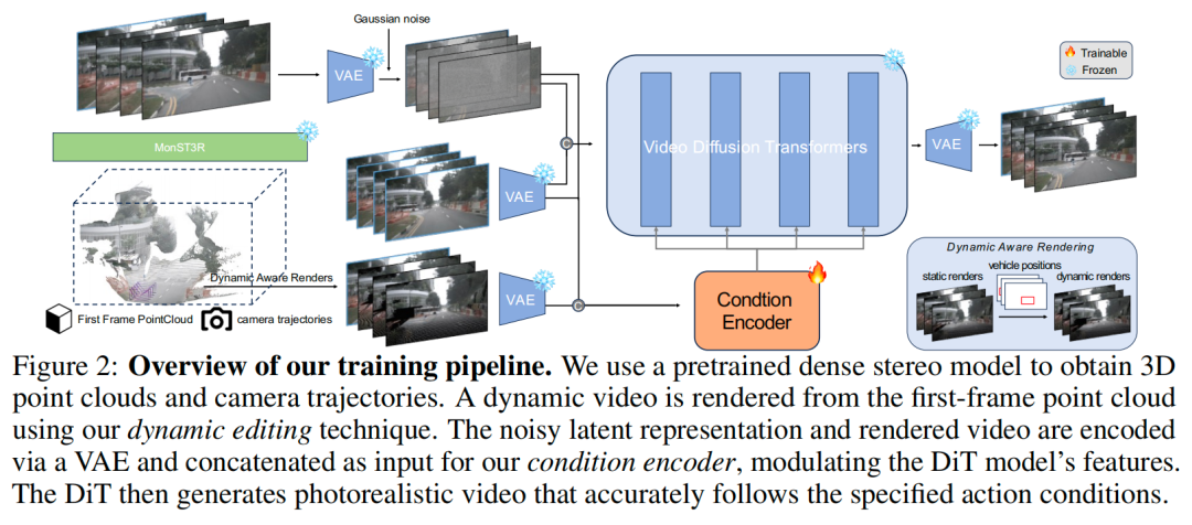 给定一个初始参考图像 和自车轨迹 ,我们的框架合成遵循输入轨迹的真实感未来帧。我们利用参考图像中的 3D 几何信息来指导世界建模。首先,我们重建一个 3D 表示,然后沿着用户指定的轨迹渲染视频序列,并处理动态目标。渲染的视频提供几何引导,用于生成时空一致、符合输入轨迹的视频。图 2 展示了整个训练流程。