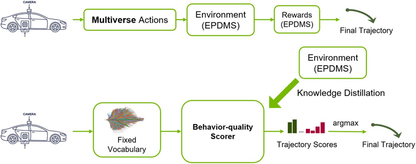 在去年的比赛中,我们提出了 Hydra-MDP 端到端自动驾驶框架。该框架不再依赖单一 路径的模仿,而是使用大量多模式的轨迹候选,并通过与环境的交互获得基于规则的奖励信号。我们使用这些奖励来训练出一个能够对不同规则维度进行打分的轨迹评分模型。相比于仅依赖人类演示的模仿学习方法,该框架更强调轨迹与环境之间的反馈关系,能够在复杂场景中更好评估和选择安全的驾驶行为,从而实现更高的鲁棒性和安全性。