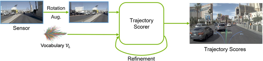 (1)基于扩散模型的轨迹生成器,提供丰富细致的动态轨迹候选;(2)超密集轨迹词表结合 Dropout 泛化策略,强化评分器对多样轨迹分布的 适应性;(3)传感器视角扰动与精细化评分模块,增强对长尾场景与微小行为差异的辨识能力。