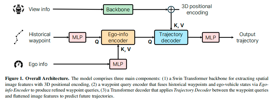 为了预测车辆坐标系下的未来路径点序列,我们使用单个前置摄像头和结构化的路径点查询。如图 1 所示,我们的架构由三个部分组成:特征提取器、自车信息编码器和轨迹解码模块。