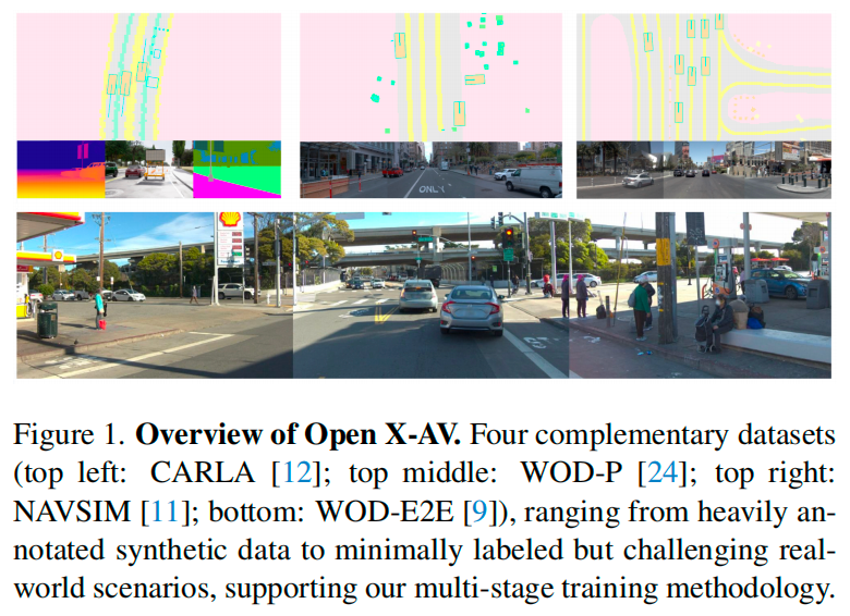 大规模、多样化的数据集对于构建具备泛化能力的人工智能系统至关重要。尽管自动驾驶汽车(AVs)可以从这种数据集中受益匪浅,但目前公开可用的数据集仍高度碎片化。每个数据集通常侧重于某一特定领域,例如带有精确标签的感知数据、用于仿真的合成数据,或对规划至关重要的大规模自动标注数据。然而,这种专业化限制了仅在单一数据集上训练的端到端系统有效应对复杂、罕见事件的能力。