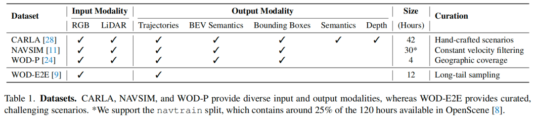 NAVSIM:来自 OpenScene,是对 nuPlan 数据集的再分发,包含 120 小时真实世界驾驶数据,采样频率为 2Hz。我们使用 nav-train 子集,过滤掉那些简单基线就能表现良好的平凡场景。