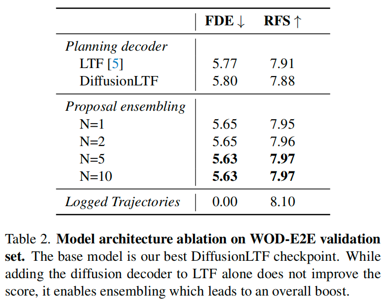 对于最终测试集提交,我们训练了 LTF 和 DiffusionLTF 的路径点解码器共享骨干网络。两种规划器的性能概览见表2。我们发现混合集成方法显著优于单个模型组件。具体来说,我们从 DiffusionLTF 中采样10个提案,这些提案可能属于不同模式并按模式分组。在每组内,我们平均轨迹并求和其对应的logits。最后,选择logit最高的模式组的平均轨迹,并再次与 LTF 的确定性规划输出进行平均,得到最终预测。