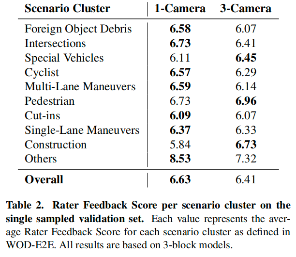 如表 2 和图 2 所示,某些场景类型(如施工区域)中三摄像头设置明显优于单摄像头变体。这表明附加视图可以带来益处,支持多视图输入具有强大潜力的观点,但其成功取决于信息整合的有效性。