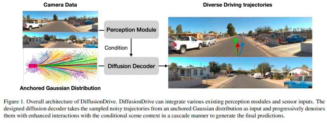 我们的模型基于DiffusionDrive,它引入了一种截断扩散策略,用于高效且多样化的轨迹生成。其架构如图1所示。不同于从随机高斯噪声中去噪的传统扩散方法,DiffusionDrive从一个锚定的高斯分布(围绕先验的多模式轨迹锚点生成)开始,并仅应用两次去噪步骤来生成最终的轨迹预测。其关键优势包括: