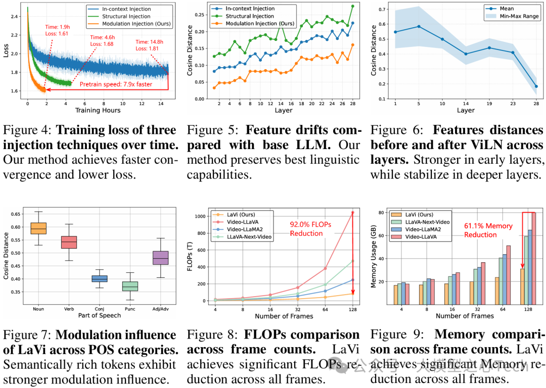 随着视频帧数增加,LaVi的FLOPs增长呈近似线性(图8),而基线模型呈二次增长,当处理128帧时,LaVi的计算量仅为Video-LLaVA的8.0%。
