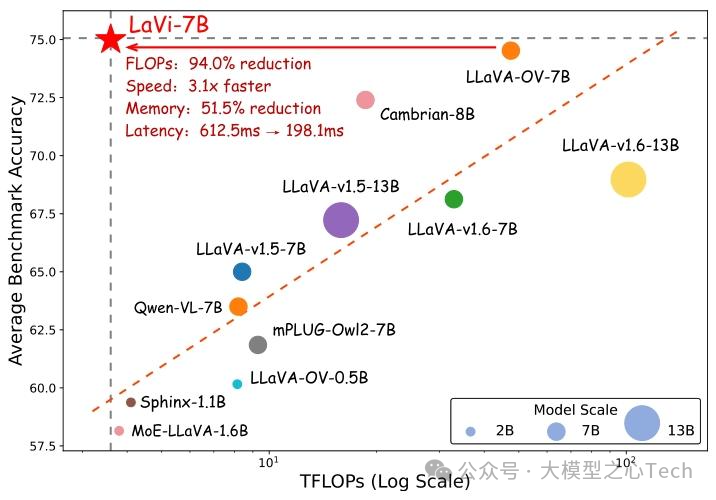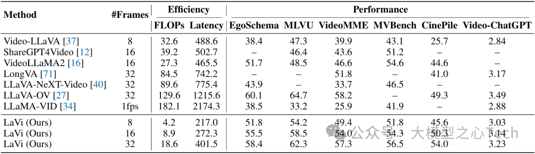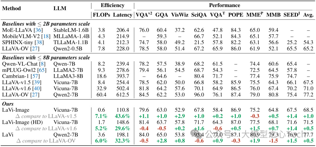 基于上述创新,研究者构建了LaVi模型,在15个图像与视频基准测试中实现"效率-性能"双突破:不仅达到当前最优性能(state-of-the-art),还在计算效率上大幅超越同类模型。例如,LaVi-7B在参数规模相同的情况下,FLOPs消耗比LLaVA-OV-7B减少94%,却能保持基准准确率持平甚至更高,为自动驾驶、实时视频分析等对延迟敏感的场景提供了切实可行的解决方案。
