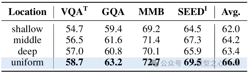 表7:调制位置的影响。将ViLN均匀分布在各层可实现更有效的多模态集成。