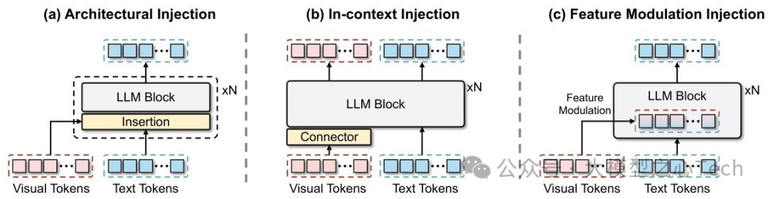 图2:大型视觉语言模型(LVLMs)中各种视觉集成技术的比较。(a)架构注入:在大型语言模型(LLM)中插入额外层以进行跨模态交互;(b)上下文注入:将视觉Token连接到文本序列之前作为初始上下文;(c)特征调制注入(我们的方法):内部隐藏状态通过视觉引导的仿射变换进行调制。