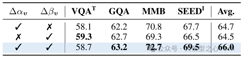 参数重要性:缩放参数Δα和偏移参数Δβ对性能提升贡献相当,同时使用时平均准确率比单独使用高1.5%-2.0%。