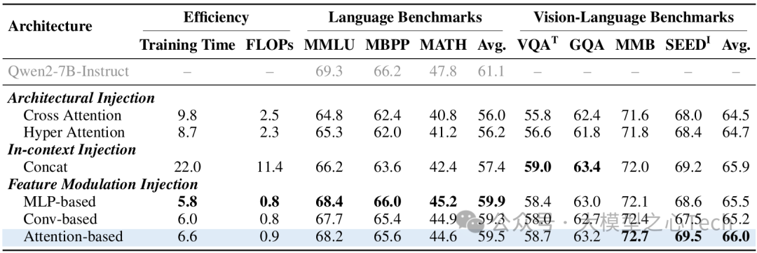 表4:在相同数据和主干设置下集成技术的比较。我们呈现了总训练时长(时间)、推理期间的浮点运算次数(FLOPs),以及三个纯语言基准和四个视觉-语言任务的准确性结果。