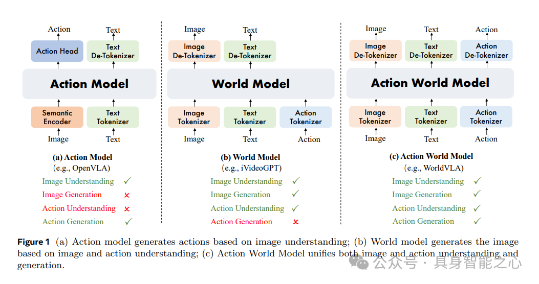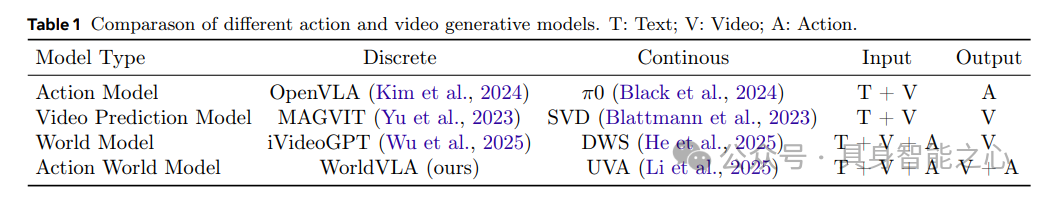 VLA模型的发展已成为机器人动作模型研究的重要焦点。这些模型通过在大规模预训练多模态大语言模型(MLLM)的基础上增加动作头或额外的动作专家模块来生成动作。MLLM 在感知和决策方面提供了强大能力,使 VLA 模型能够在广泛的机器人任务中表现出更强的泛化能力。然而,一个显著的限制仍然存在:这些模型往往缺乏对动作的全面理解,因为动作仅被视为输出,而未被集成作为输入进行深入分析。相比之下,世界模型展示了基于当前观察和动作预测未来视觉状态的能力,从而实现对视觉信息和行为动态的双重理解。尽管有这一优势,世界模型受到无法直接生成动作输出的限制,导致功能缺口,限制了其在需要显式动作规划的场景中的应用。