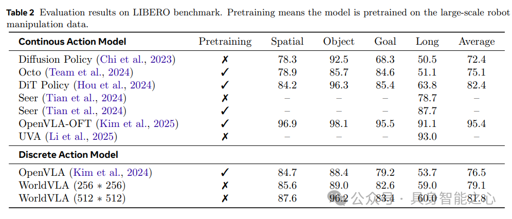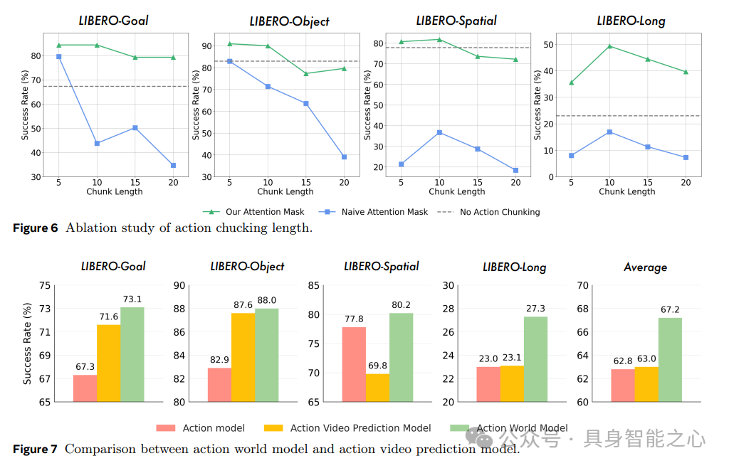 在 LIBERO 基准上的实验显示WorldVLA 比具有相同主干的动作模型的抓取成功率高 4%。此外,与普通世界模型相比,WorldVLA 显示出更优越的视频生成能力,并在 LIBERO 数据集上降低了 10% 的 Fréchet 视频距离(FVD)。这些结果强调了集成世界模型和动作模型的互利性,突显了用于图像和动作理解与生成的统一框架的优势。在动作块生成的背景下,当采用传统的自回归方法时,抓取成功率会下降 10% 到 50%。然而,我们的注意力掩码策略的实施显著缓解了这种下降,在抓取成功率上产生了 4% 到 23% 的提升。