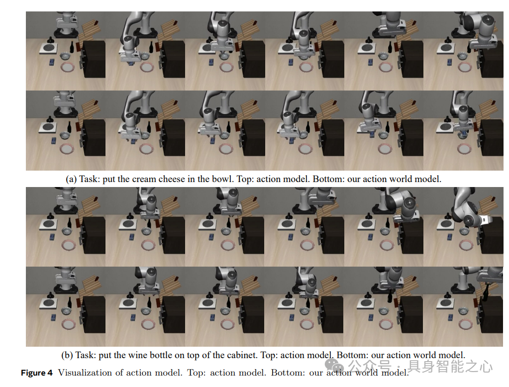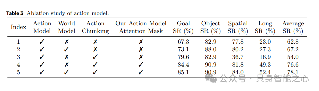 定量结果表明,世界模型的集成显著提高了动作模型的性能。世界模型的基本功能涉及基于当前状态和给定动作预测环境的后续状态,这种生成过程本质上促进了对系统底层物理动态的理解的获取,这是在诸如抓取等灵巧操纵任务中成功执行的关键前提。此外,世界模型赋予系统前瞻性模拟的能力,使其能够预测潜在动作的后果,优化动作选择以最大化任务成功的概率。