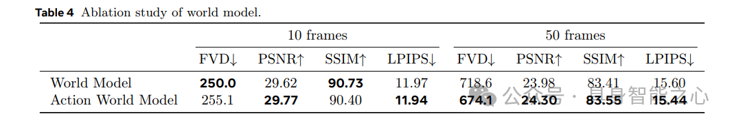 对于动作模型评估,每个任务在不同初始状态下评估 50 次滚动,并记录成功率(SR)。对于世界模型评估,我们使用验证集并记录 FVD、PSNR、SSIM 和 LPIPS 值。