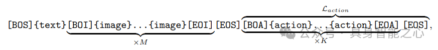 动作模型的任务是在给定文本指令和图像观察的情况下生成动作。文本输入是 “What action should the robot take to + 任务指令 + ?”。整体token序列包含文本、图像和动作token,以及相应的开始和结束符号。输入包含 M 个图像,输出包含 K 个动作。我们只计算动作token的损失 。