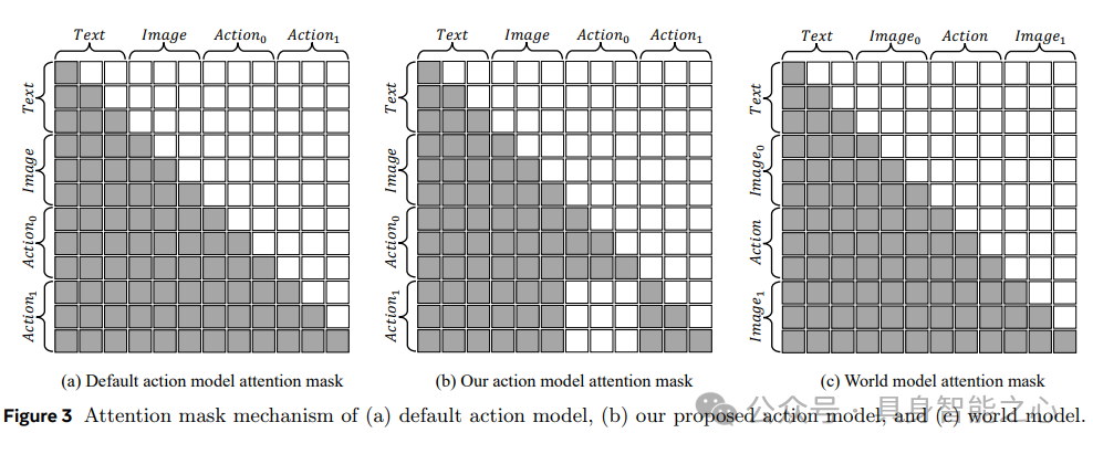 自回归模型中的标准注意力机制通常采用因果注意力掩码,该掩码限制当前token只能访问来自先前token的信息,排除任何后续token。然而,这种传统配置被证明不足以生成动作块,即多个连续动作。虽然基础 MLLM 由于在各种数据集上的大规模预训练而在图像和文本领域表现出强大的泛化能力,但其在动作领域的有效泛化能力相对有限。因此,在默认注意力掩码下,源自早期动作的误差会传播到后续动作,导致性能下降。为解决这一限制,这里引入了一种专为动作生成设计的替代注意力掩码。这种修改后的掩码确保当前动作仅依赖于文本和视觉输入,同时禁止访问先前动作。这种设计使自回归框架能够并行生成多个动作。世界模型部分遵循传统的因果注意力掩码。