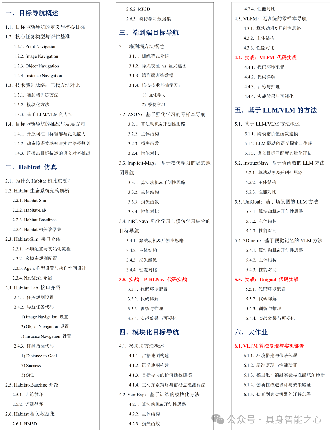 具身导航本身就是综合多个领域技术的方向,而目标驱动导航尤其如此。需要掌握来自自然语言处理、计算机视觉、强化学习和场景图相关的知识。学习目标驱动导航,是一个一站式强化多领域知识的好机会,但这样的学习路径往往非常痛苦。同时掌握多个领域的知识已经足够困难,而各领域的论文数量繁多、知识碎片化,入门者往往还没了解各个领域就已然放弃。如何从零散论文中提炼框架、掌握领域发展趋势,是初学者的常见挑战。同时,学习目标驱动导航需要结合实际任务完成闭环,但缺乏系统的实战指导,难以从理论过渡到实践。另一方面,基于Habitat生态的导航研究由于缺少高质量文档,提高了入门难度。