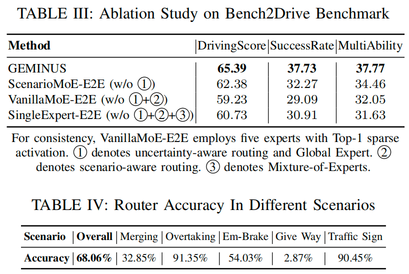 比较GEMINUS与ScenarioMoE-E2E。 进一步整合不确定性感知路由机制和全局专家带来了额外的性能增益。驾驶评分提升了4.83%,成功率提升了22.06%,多能力均值提升了19.41%。不确定性感知路由机制和全局专家的集成显著增强了模型的鲁棒性和稳定性,尤其是在路由器无法自信地判断当前状况的模糊场景中。