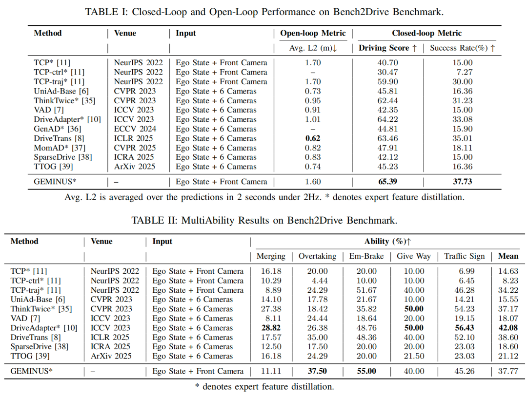 GEMINUS在Bench2Drive闭环基准测试中超越了现有方法,在驾驶评分(Driving Score)和成功率(Success Rate)上均达到了最先进水平,即使仅使用单目视觉输入。此外,消融研究表明,相较于原始的单专家基线模型,GEMINUS在驾驶评分上提升了7.67%,在成功率上提升了22.06%,在MultiAbility-Mean上提升了19.41%。代码将发布于:https://github.com/newbrains1/GEMINUS。
