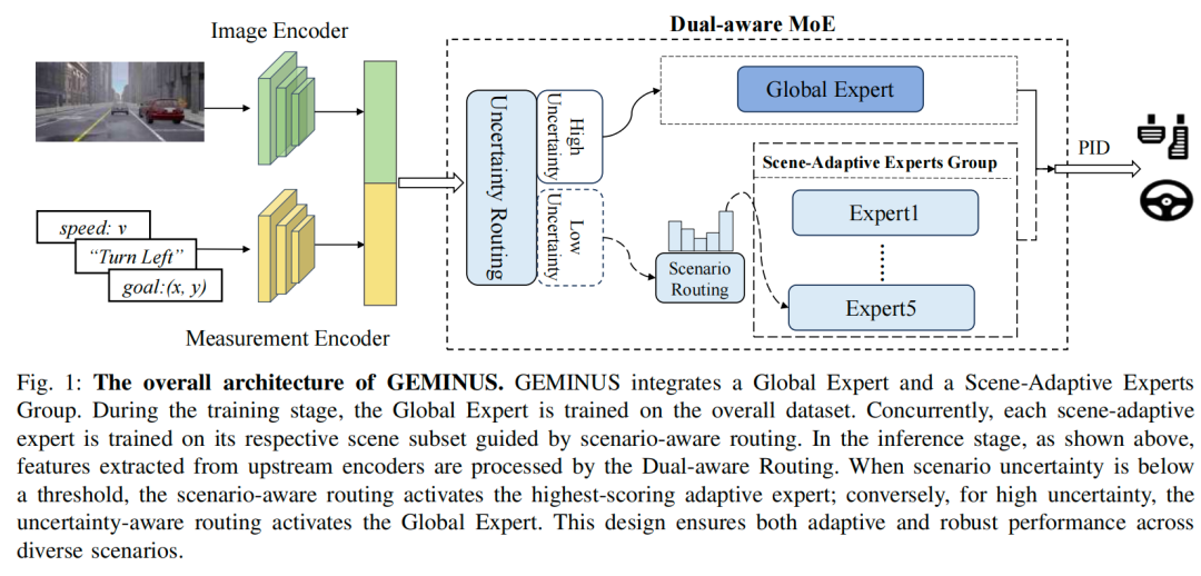 通过灵活地耦合多个策略分布,这种概率公式为有效建模端到端轨迹规划中的多模态分布并解决模态平均问题提供了有前景的框架。尽管学习此类混合模型可能存在非凸优化挑战,但MoE的深度学习实现通常会通过识别和分配最合适的专家来简化这一过程。值得注意的是,采用硬分配(Hard Assignment)方法(即为给定样本选择单一的“最佳”专家)的模型对于多模态分布非常有效且计算高效。这是因为硬分配直接选择了最匹配的行为模态,避免了所有专家输出的平均化,从而进一步缓解了模态平均问题。基于这些理论基础,本文提出了GEMINUS,这是一种专门为多样化且复杂的自动驾驶场景量身定制的独特MoE框架。其核心是一个具备场景感知和不确定性感知能力的双感知路由器,用于从全局专家和场景自适应专家组中动态激活专家。在推理阶段,双感知路由器处理由编码器提取的中间特征 。它根据不确定性度量 和场景专家的分数 来确定最终输出 ,其形式化表达为: